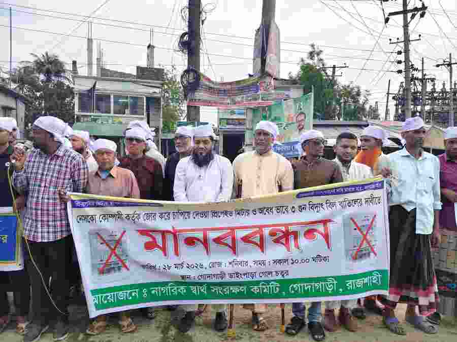 রাজশাহীর গোদাগাড়ীতে প্রিপেইড মিটার স্থাপন বাতিলের দাবিতে মানববন্ধন করেছে নাগরিক স্বার্থ সংরক্ষণ কমিটি।