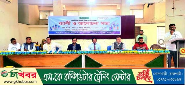 ’প্রতিবন্ধী অধিকার সংরক্ষণ সংস্থা’র সভাপতি মোঃ নজরুল ইসলাম-এর সভাপতিত্বে অনুষ্ঠিত আলোচনা সভায় প্রধান অতিথি হিসেবে উপস্থিত ছিলেন গোদাগাড়ী উপজেলা নির্বাহী অফিসার (ইউএনও) মোঃ নাজমুস সাদাত রত্ন।