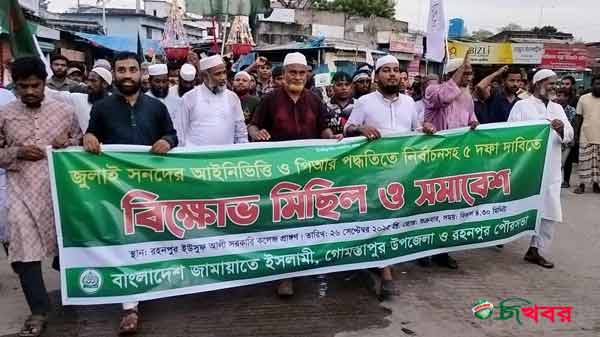 চাঁপা ইনবাবগঞ্জের গোমস্তাপুরে ৫ দফা দাবিতে বিক্ষোভ মিছিল ও সমাবেশ করেছে জামায়াতে ইসলামী। শুক্রবার বিকেলে উপজেলা ও রহনপুর পৌর জামায়াতের উদ্যোগে রহনপুর কলেজ মোড় থেকে বিক্ষোভ মিছিল শুরু হয়। পরে পৌর এলাকার বিভিন্ন সড়ক প্রদক্ষিণ শেষে রহনপুর রেলস্টেশন চত্বরে গিয়ে শেষ হয়।সেখানে আয়োজিত সমাবেশে বক্তব্য রাখেন জেলা জামায়াতের নায়েবে আমীর ড.মিজানুর রহমান, জেলা জামায়াতের কর্মপরিষদ সদস্য তরিকুল ইসলাম বকুল, জামায়াতের উপজেলা আমীর ইমামুল হুদা, রহনপুর পৌর জামায়াতের আমীর মনিরুজ্জামান ডাবলু, জামায়াতের উপজেলা পরিষদের চেয়ারম্যান পদপ্রার্থী মাওলানা আব্দুর রহমান,